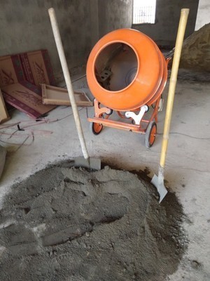 简易小型混凝土搅拌机搅拌砂浆水泥作业现场。